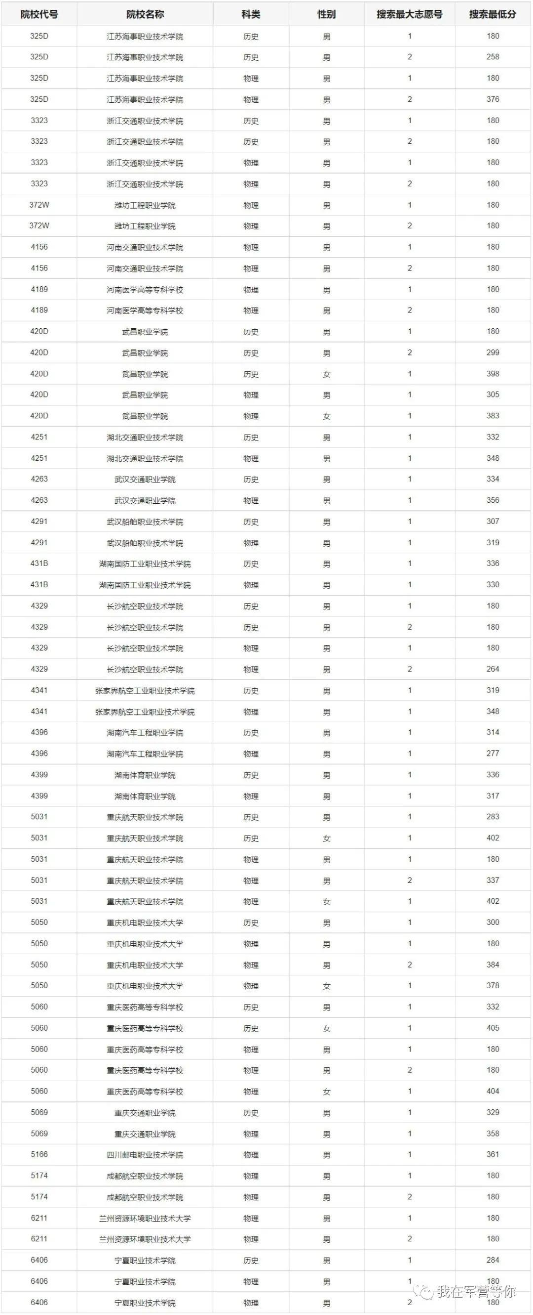 在性别上,女生可报考的士官院校虽然没有男生多,但是也有10所学校可供选择。不过值得注意的是,在本次招生录取中,女生的最低分要普遍高于男生,其中女生收分最高的学校为滨州职业学院,最低分为489分;而男生收分最高的学校为重庆医药高等专科学校,最低分为437分。