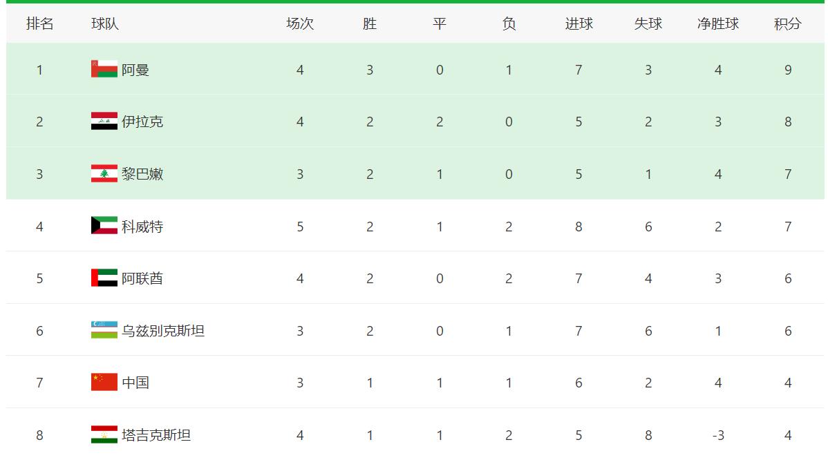 中国队暂时被挤到第七,但并不影响中国队握有主动权,中国队目前是少赛1场,加上3分后就能够确保挤进前五。E组卡塔尔队有可能被挤到小组第二,加入小组第二比拼阵营,但这并不影响整体局势,阿曼队本身就处于小组第二排名的前四行列。