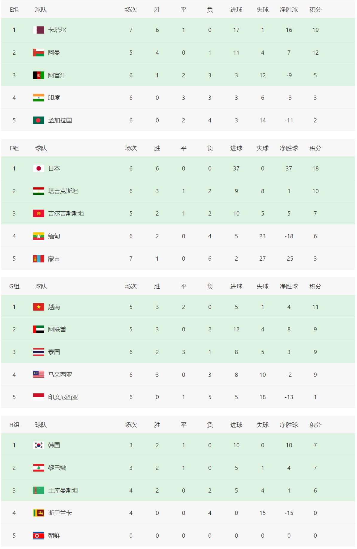 F组:日本队提前拿到小组头名,早早确定12强席位,综合实力独一档。塔吉克斯坦和吉尔吉斯斯坦竞逐小组第二,局势相对还比较复杂。缅甸队之前4-3击败过塔吉克斯坦,目前6战拿到6分,其理论上并未出局,只是缅甸队整体局势处于明显被动。蒙古队7战拿到3分,大概率是本组的垫底队。