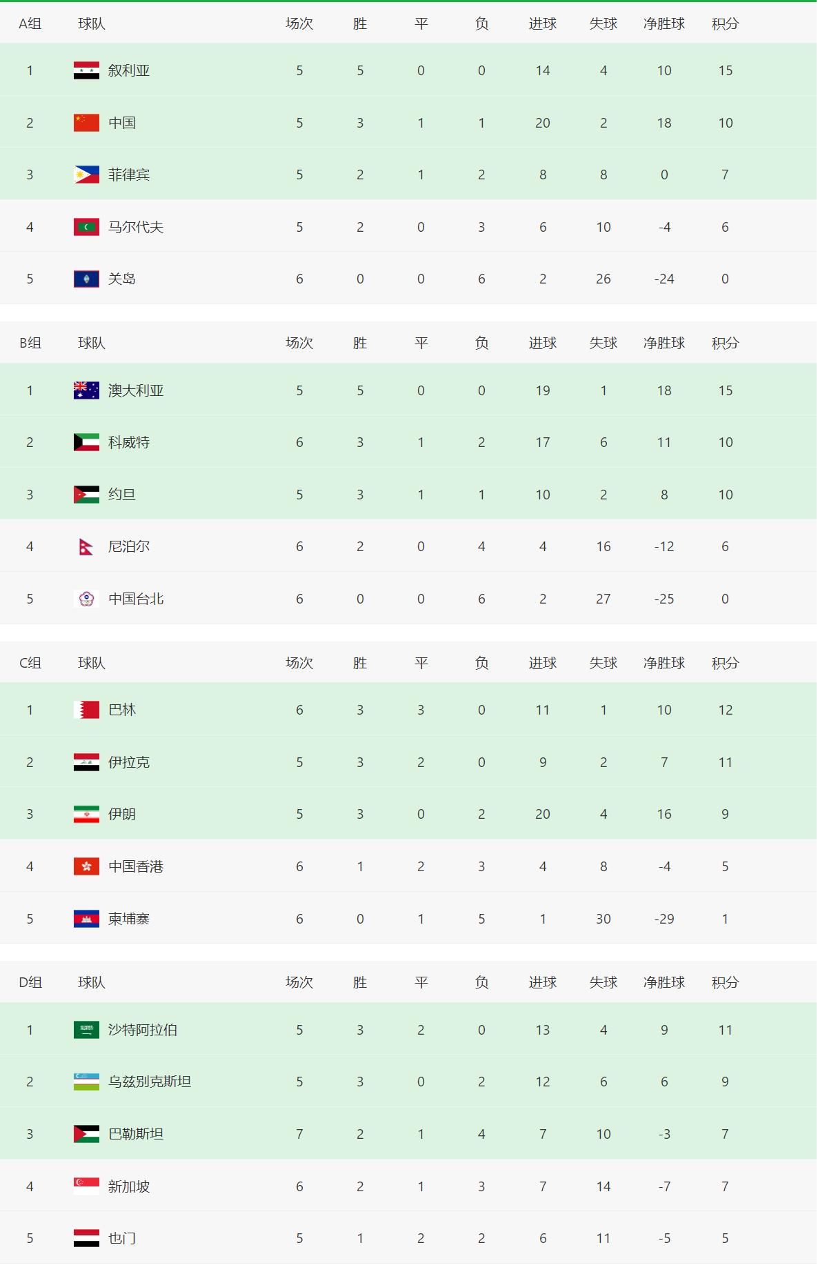 A组:由于赛程滞后,积分数据暂未更新,中国队积10分继续排名小组第二。叙利亚队与菲律宾两回合已经打完,叙利亚队是双杀对手,接下来再赢下关岛和马尔代夫即可锁定小组头名。关岛队六战全败,积0分,大概率是垫底队。