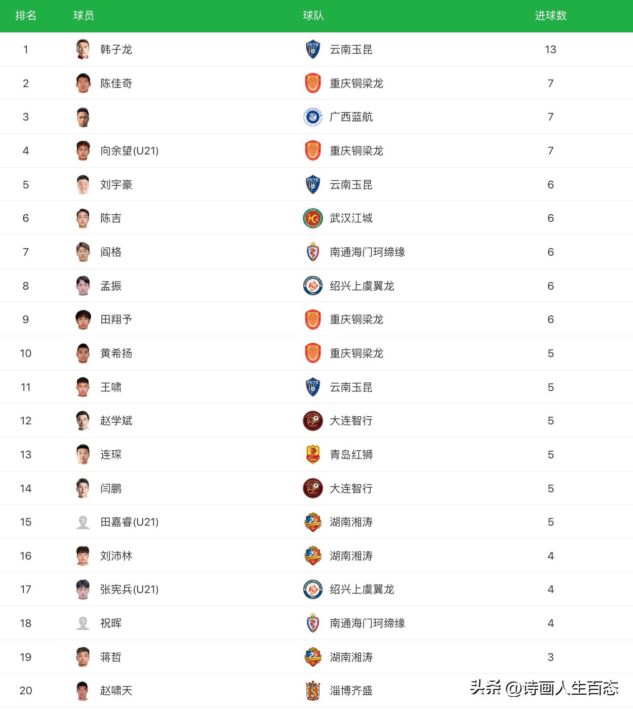 射手榜单中,云南玉昆的韩子龙13球遥遥领先排在榜首位置;重庆铜梁龙的陈佳琪,广西蓝航的XX,重庆铜梁龙的向余望都打进7球排在第二到第四的位置。