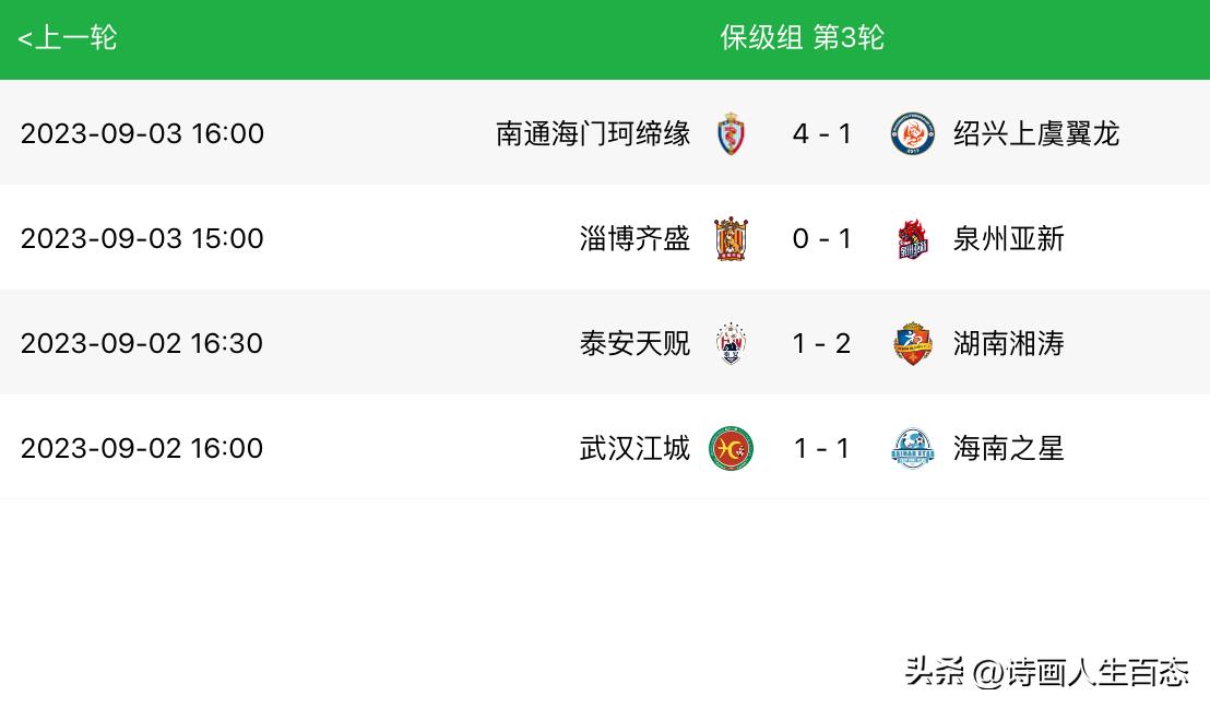 保级组南通海门珂缔缘,泉州亚新,湖南湘涛本轮收获3分;武汉江城,海南之星本轮战平收获1分;泰安天贶,绍兴上虞翼龙,淄博齐盛本轮落败积0分。