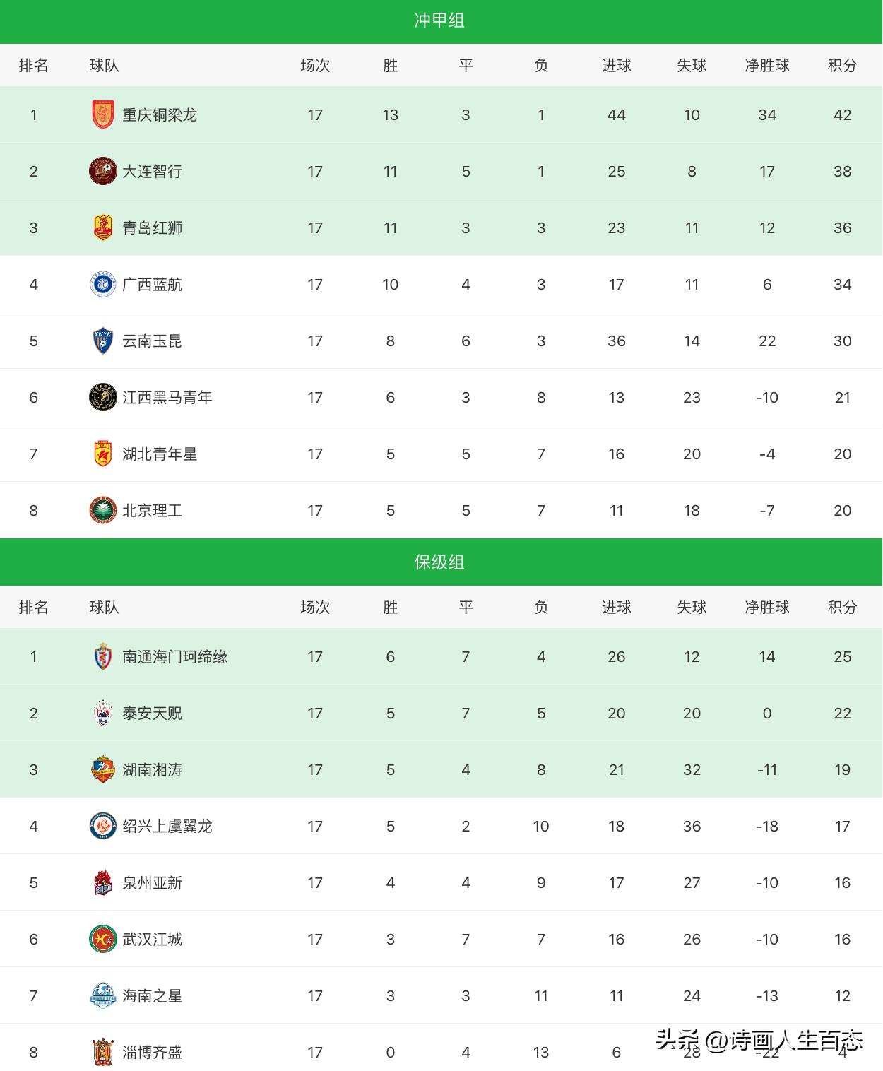 中乙最新积分榜:重庆霸榜将升甲,大连青岛广西云南竞争,淄博降级