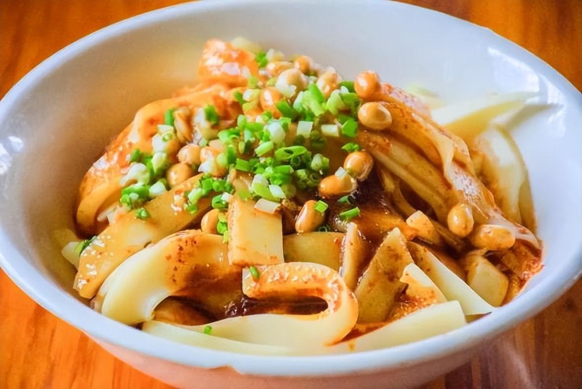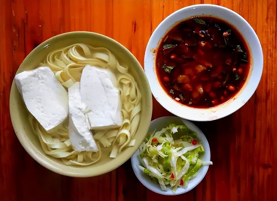 面用的是当地的宽刀碱水面,再搭配上蘸水,鱼香菜,每嗦上一口,那种鲜麻辣的香味,还带有独特的豆香味,令人直呼“安逸”。
