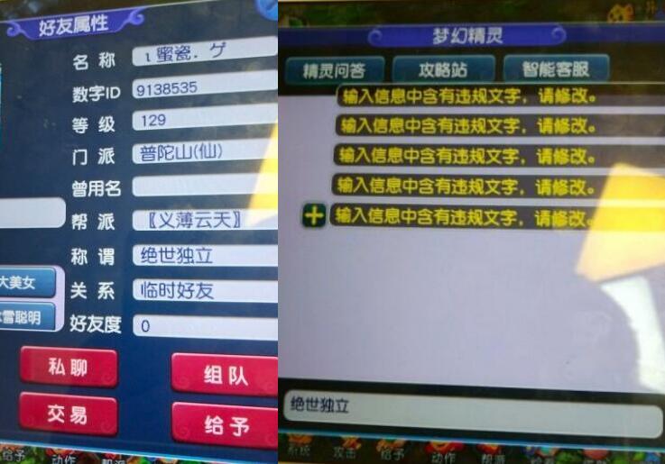 在梦幻中玩家的角色拥有很多的称谓,只是有一些称谓是梦幻早期的时候上线的,那个时候称谓是不违规的,就像上面这位玩家看到的绝世独立称谓,但是这玩家像梦幻精灵搜索绝世独立的时候却被系统提示搜索的信息中存在着违文字,就相当于绝世独立称谓是违规的。