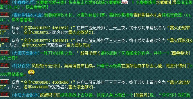 一般以名字+ID形式命名的那些角色全部都是通过转区的方式获得的特殊角色昵称,这样的角色昵称是会有一次免费改名资格的,上面的这组五开就将自己的免费改名资格给浪费了,因为他改的名字全部都是雷火滚出梦幻,大家应该都知道,现在雷火就是梦幻西游的运营工作室,以这样的方式发泄自己的不满,这位玩家的角色很有可能会被关进思过崖,被强行修改角色昵称。