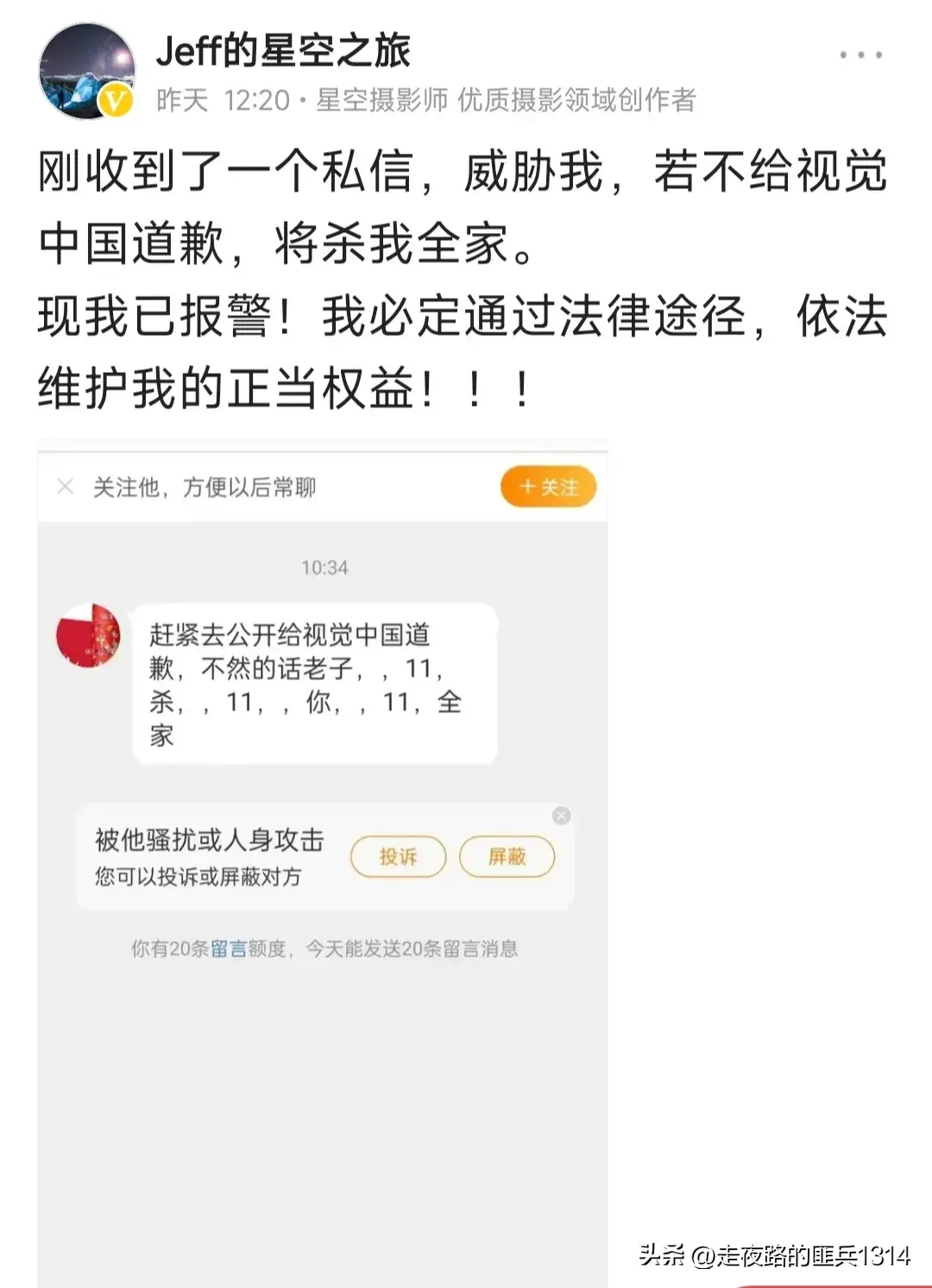 不知道是动了谁的奶酪,摄影师遭到了死亡威胁,私信要戴先生给视觉中国道歉,否则要杀他全家。