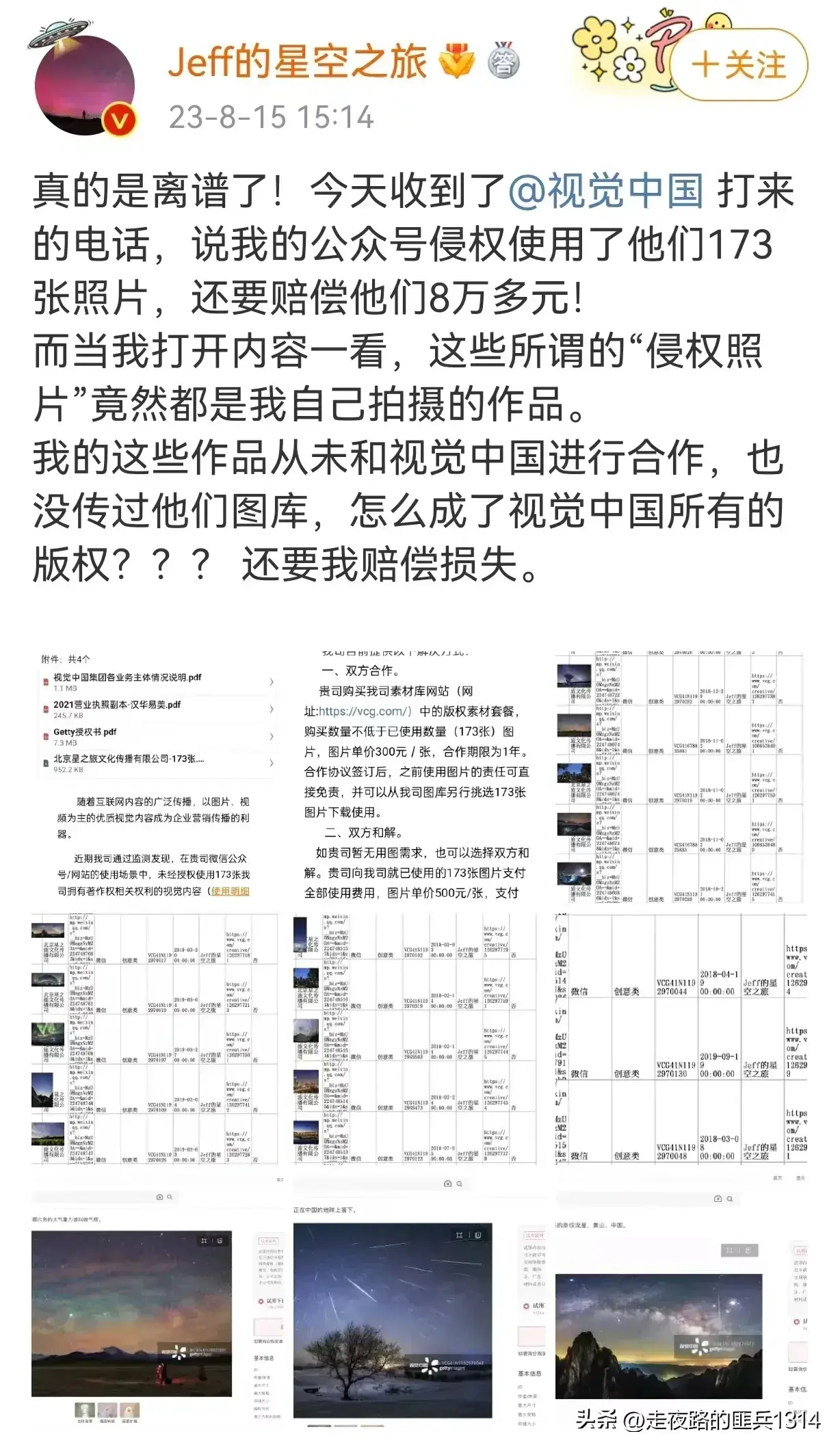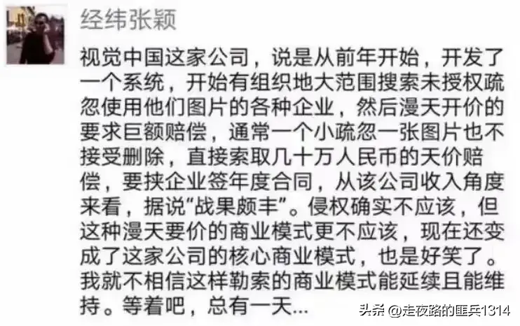 视觉中国整的这一出迅速在网上传播后,人们不断扒出这家公司的黑料。原来它还是惯犯,到处碰瓷,打着维护权益的幌子告别人,再要求巨额赔偿。这就是它发家的秘籍。