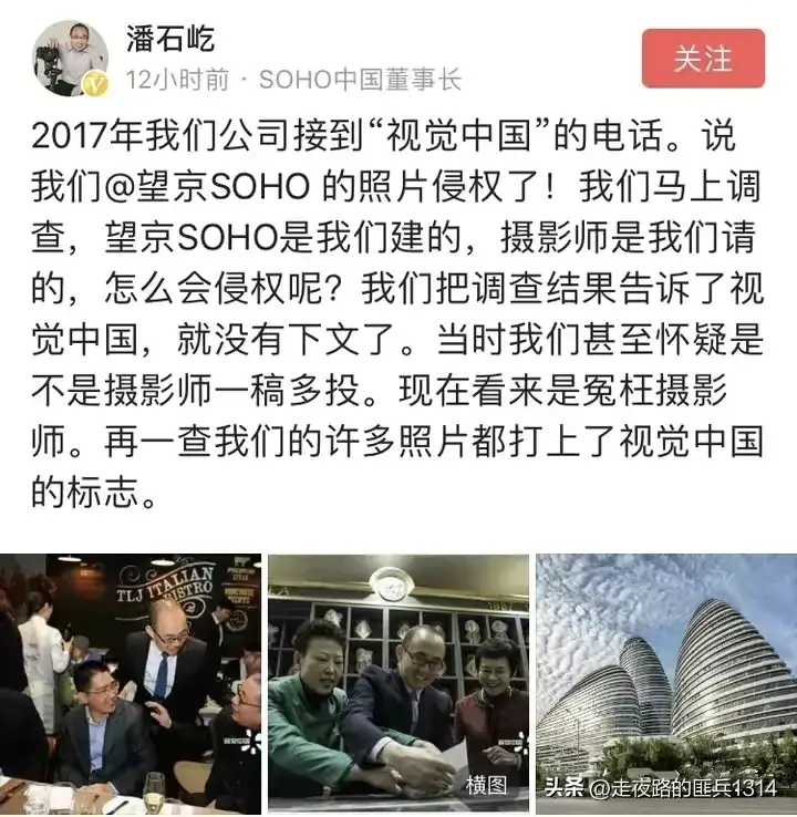 潘石屹曾经也被这家公司碰瓷,自家盖的大楼,自家请的摄影师,结果拍的作品视觉中国说侵犯他们的版权,真是无稽之谈。
