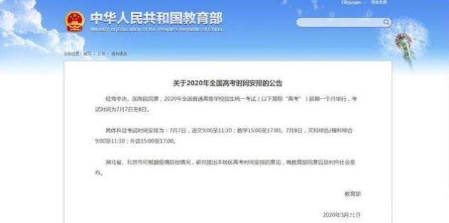 教育部宣布高考延期一个月