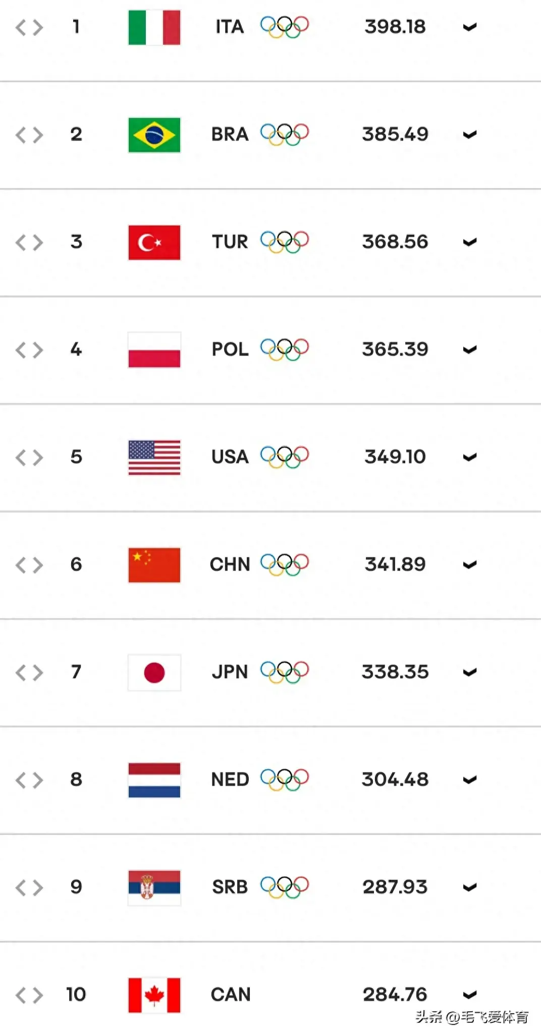 女排最新世界排名:意大利第1 巴西第2 土耳其第3 中国高居第6 日本第7
