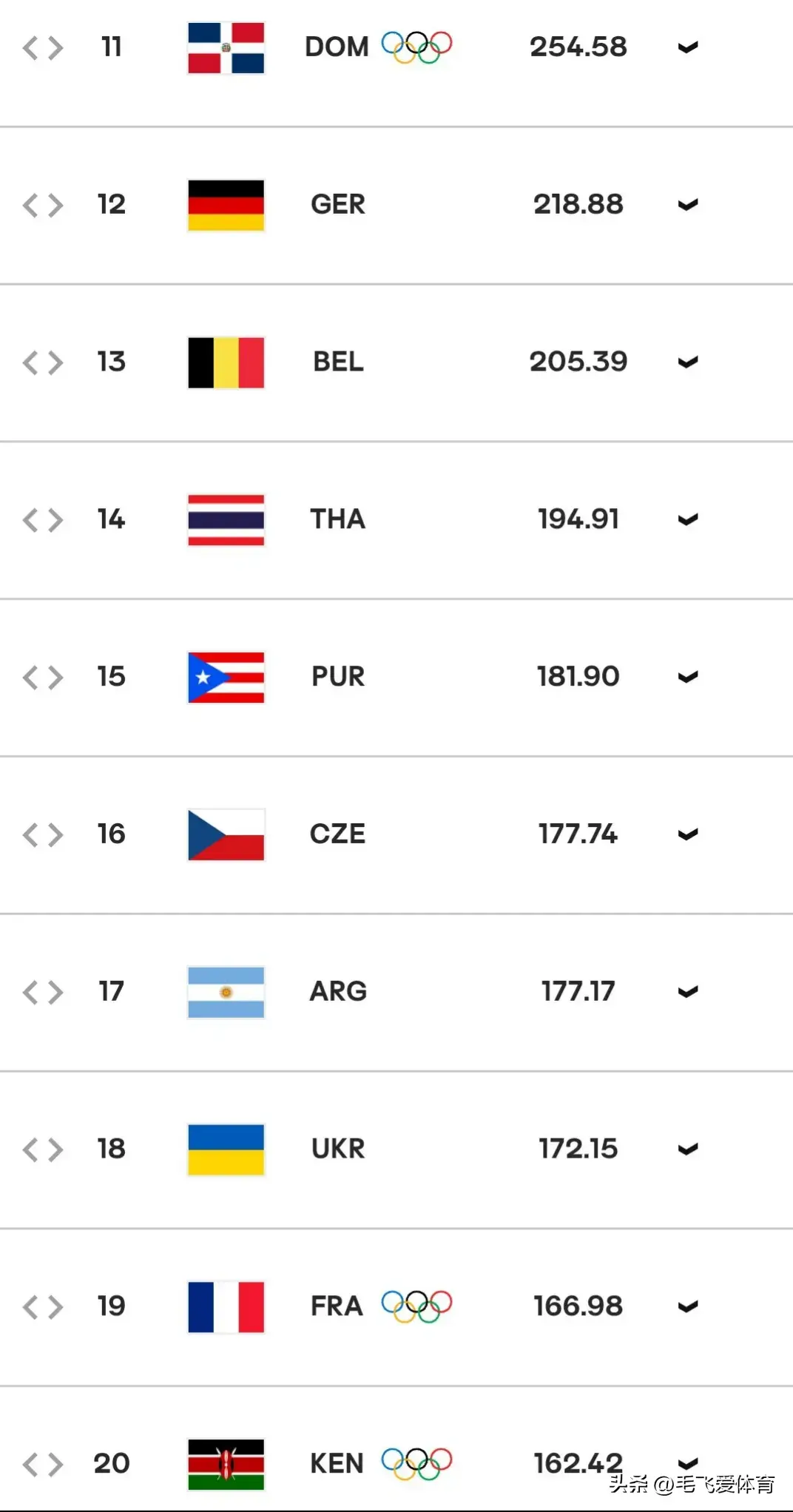 波多黎各女排、捷克女排、阿根廷女排、乌克兰女排世界排名保持不变分别是第15到18位;两支取得巴黎奥运会参赛资格的法国女排和肯尼亚女排世界排名第19和第20位。