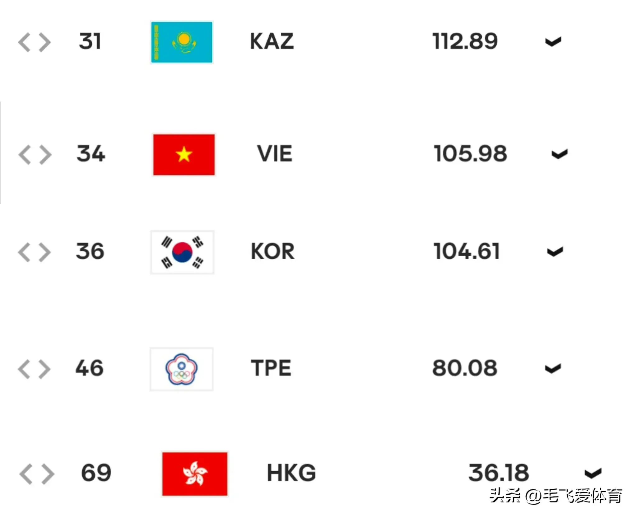 亚洲其他队伍排名,哈萨克斯坦女排世界排名第31位;越南女排世界排名第34位;韩国女排世界排名已经降至第36位;中国台北女排世界排名第46位;中国香港女排的世界排名第69位。