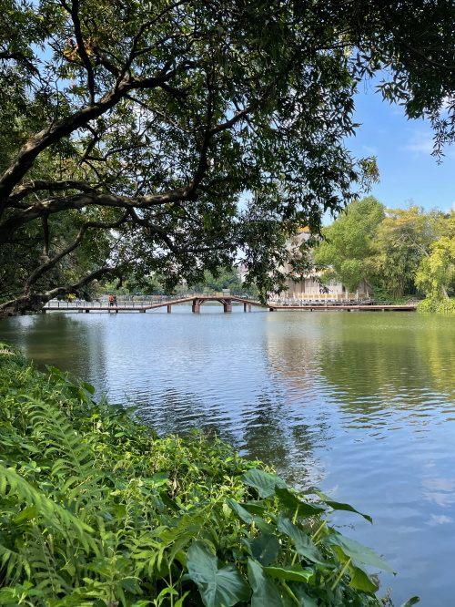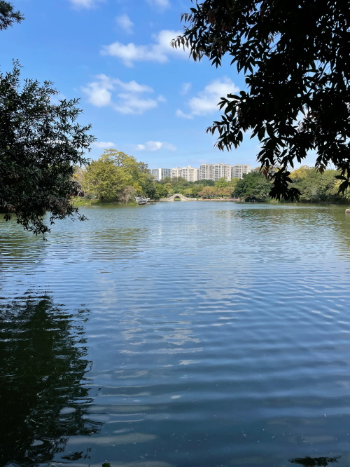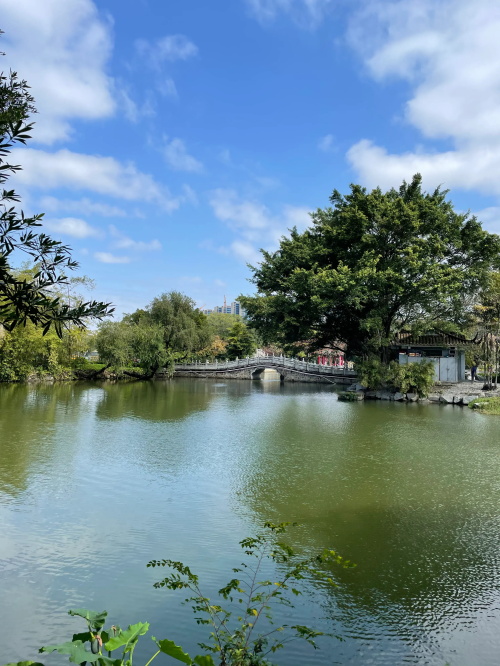 公园水景面积很是宽广,各式连桥连串其中,微风吹拂,让人神清气爽。