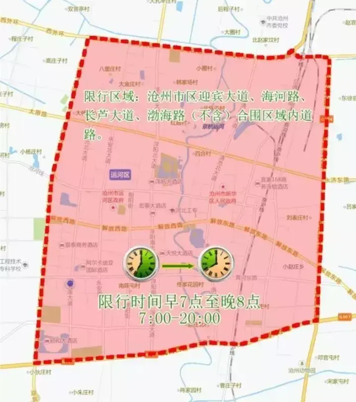限行区域为:沧州市区迎宾大道、海河路、长芦大道、渤海路(不含)合围区域内道路。