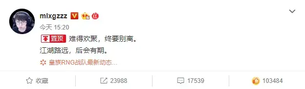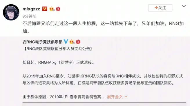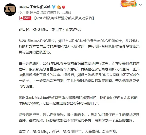 北京时间7月16日15点20分,时间秒针刚过,RNG电子竞技俱乐部与RNG.MLXG同时发布微博公告,宣布RNG.MLXG从即日起,正式退役。