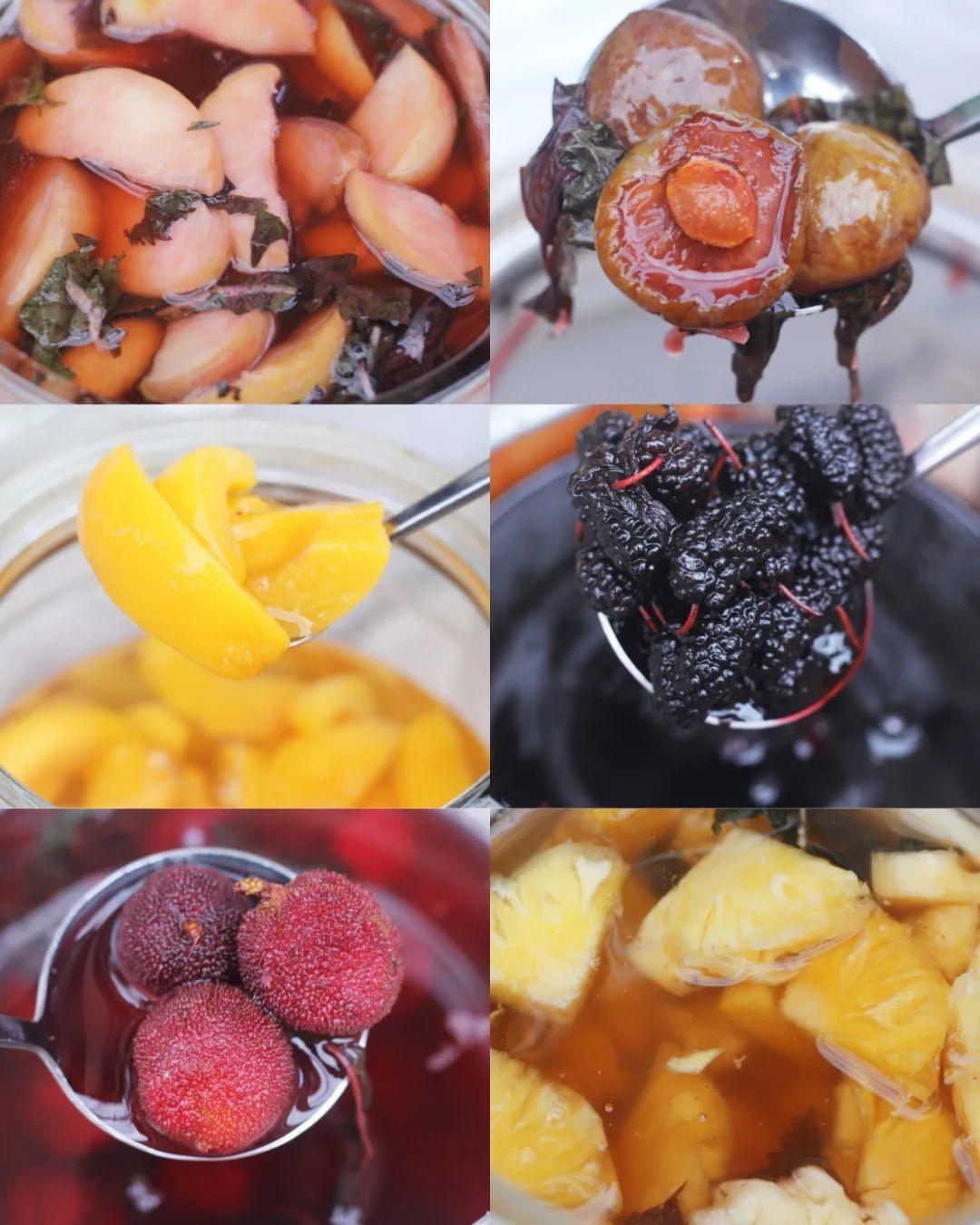 小小的推车上放着六个透明的玻璃罐子,杨梅、菠萝、黄桃、李子、桑葚等各色水果泡在紫苏水中,晶莹剔透的样子直勾人口水。