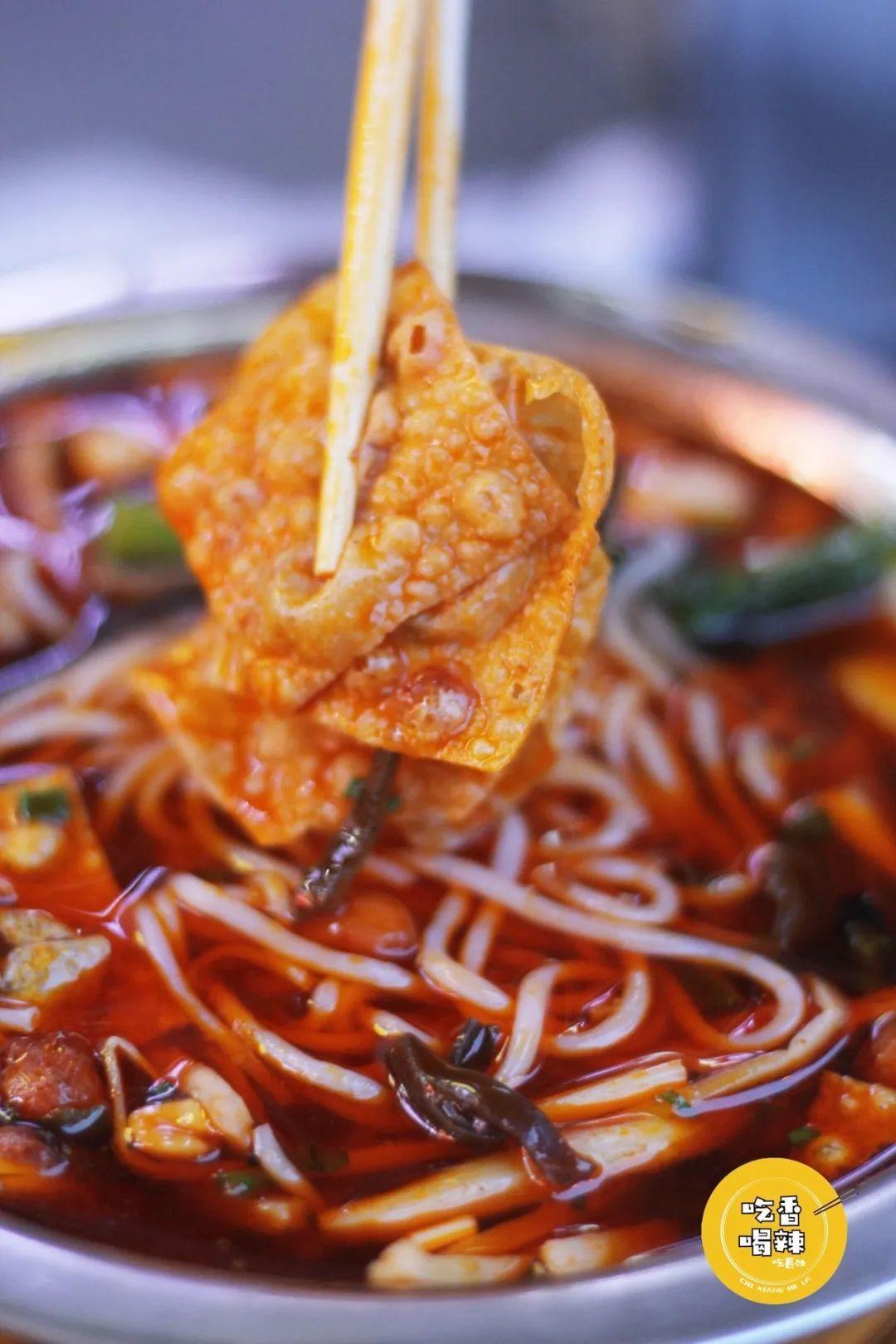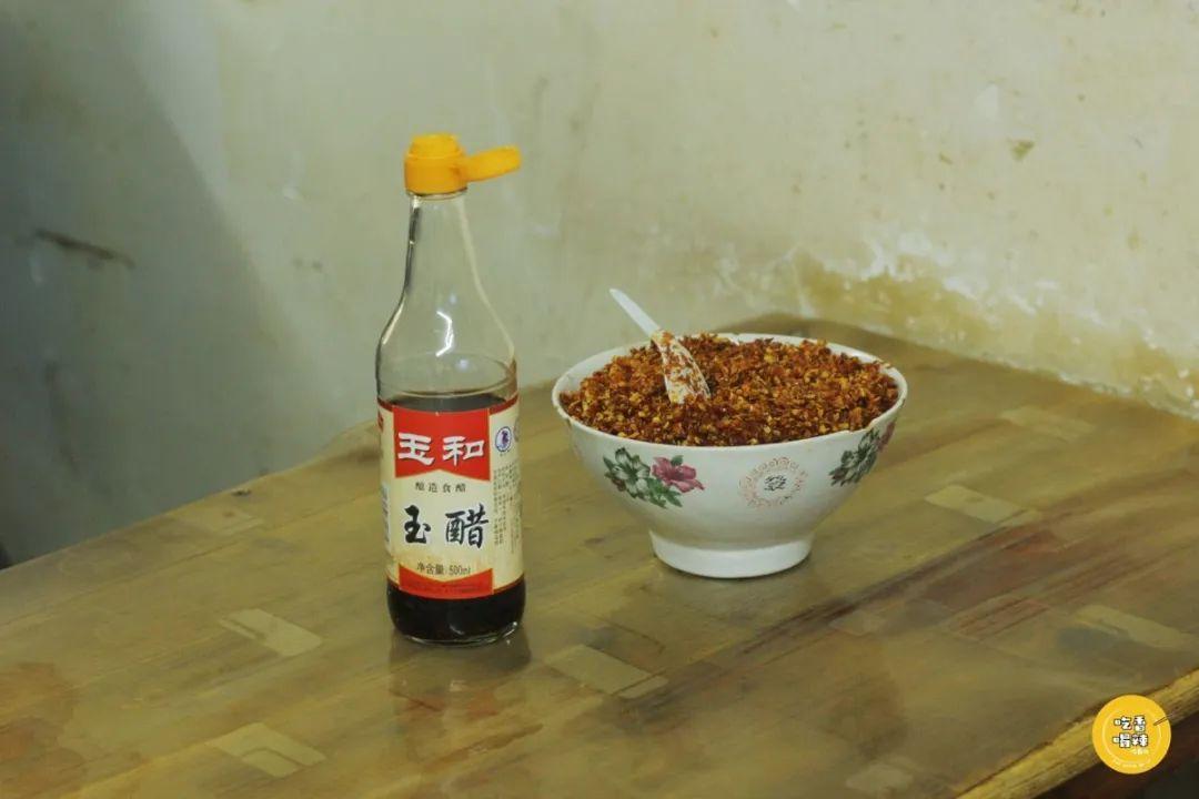 桌子上有用大碗装的干辣椒、剁辣椒和猪油渣,随自己的喜好进行添加。