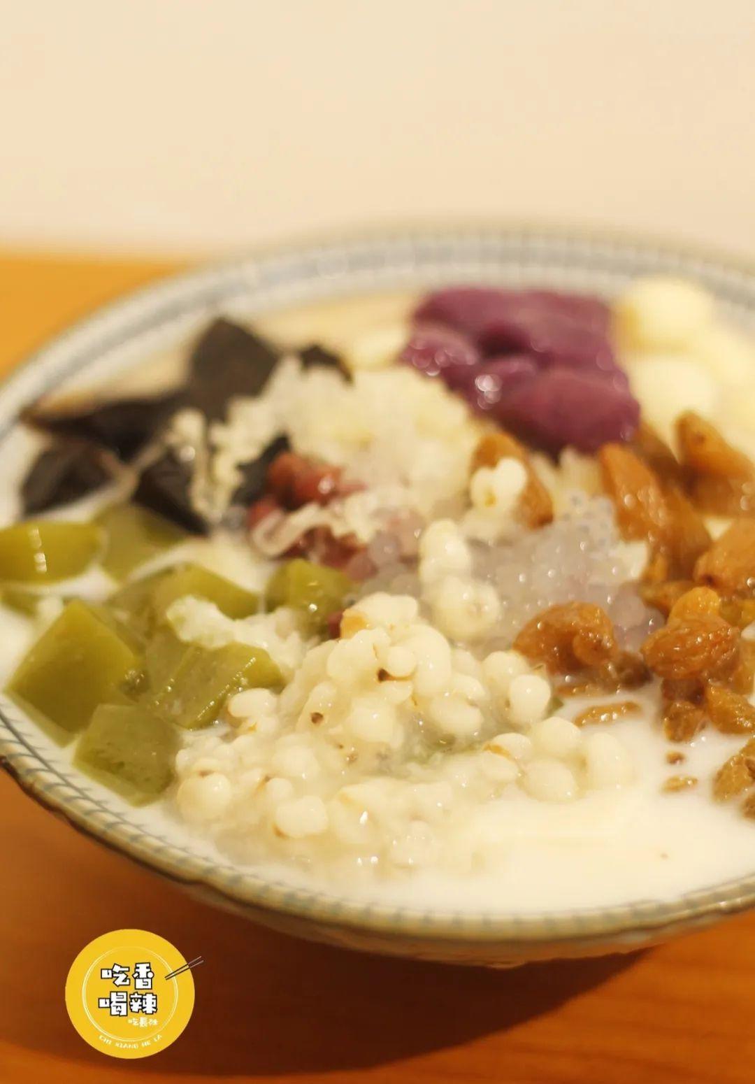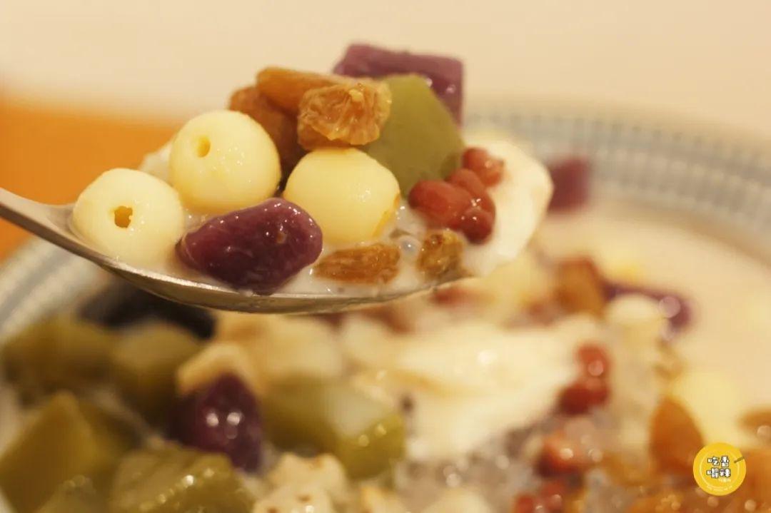 配料有15种之多,抹茶果冻、龟苓膏、鹰豆、芋圆、薏米、西米、葡萄干、红豆、莲子、银耳......还有椰奶、红糖来增味。