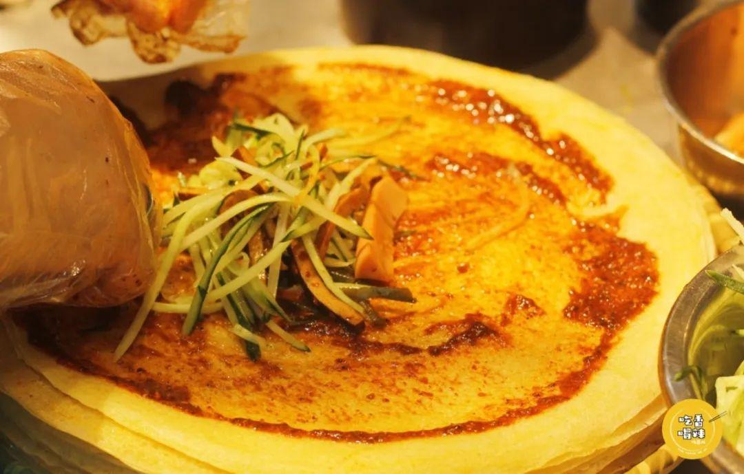 胖姨家的丝娃娃,面皮透薄而有韧劲,刷上酱料、辣椒后,再裹入海带丝、土豆丝、黄瓜丝、香干丝四种素菜,素菜脆香,酱料酸爽!