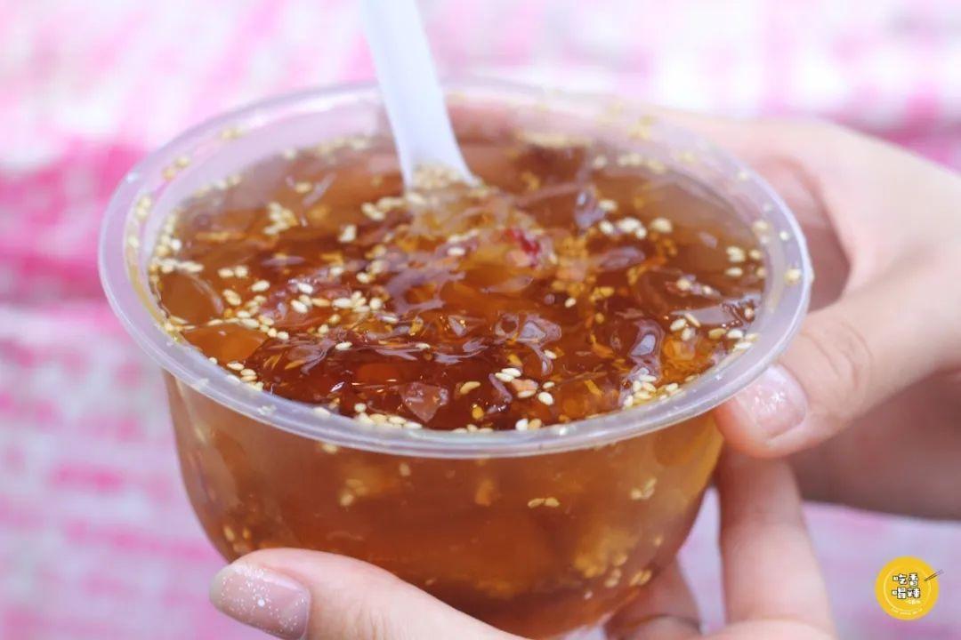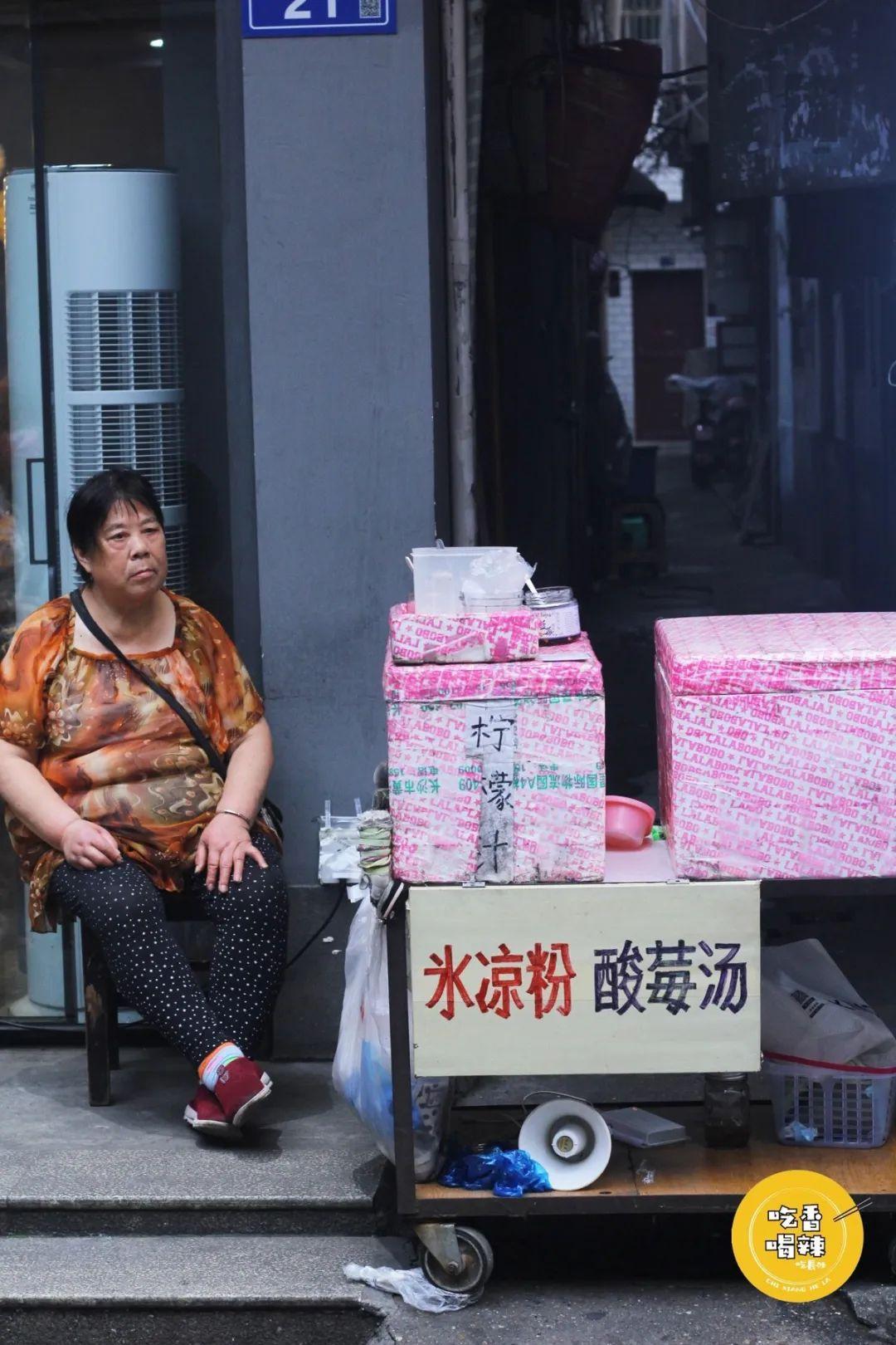 没有招牌,没有名字,就卖两样东西,一碗冰凉粉和一碗酸梅,阿姨就住在巷子里,在自家门口做点小生意,很多学生都是她的回头客!