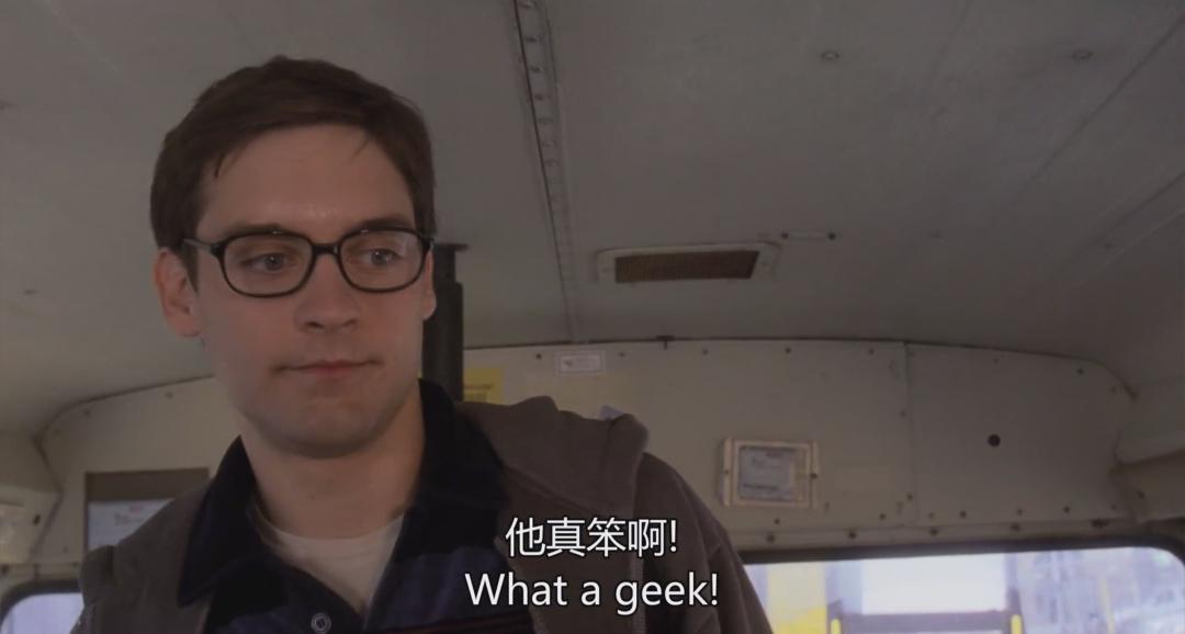 总是有一搭没一搭地和彼得·帕克说一些奇怪的话,比如电影一开始,彼得和奈德一直盯着利兹看,坐在角落的MJ说了一句:“太迟了,你们就是屌丝。”