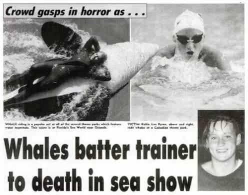一个年仅 20 岁的兼职鲸鱼训练员 Keltie Byrne 不慎跌入了训练池里,Tilikum 游上去,死死咬住了她的脚,将她拖入水底,疯狂地左右摇晃。