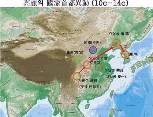 这幅图是宋朝时期,高丽的首都变动,从成都迁往西安,期间还到过开封一游,最后终于回到半岛,(这幅图描述是没有太大问题的,因为真实历史中这一时期的朝鲜曾经一度亡国,首都变动是流亡政府迁移)