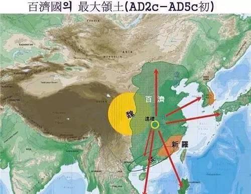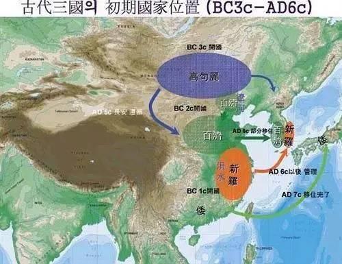 时间到了西汉时期,嗯,虽然这张图上找不到西汉,檀君朝鲜分裂成了三个国家,这一时期新罗占据了黄河以南,百济占据了黄河以北,(什么?你说汉朝?很明显在黄河里游了四百年的泳)
