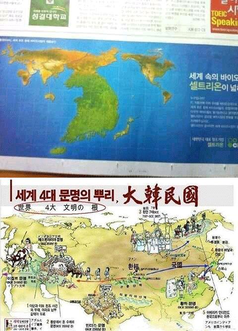 这幅地图大致上描述了韩国的,不对是人类文明的起源,韩国自古埃及开始迁移,途经古巴比伦,古印度,古中国,是四大文明的根源,最后北上西伯利亚,因为太冷,返回朝鲜半岛,并最终定居于半岛。