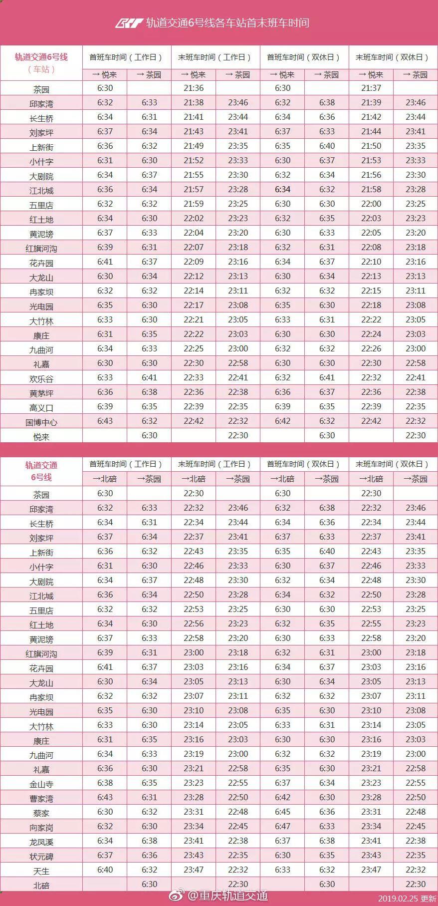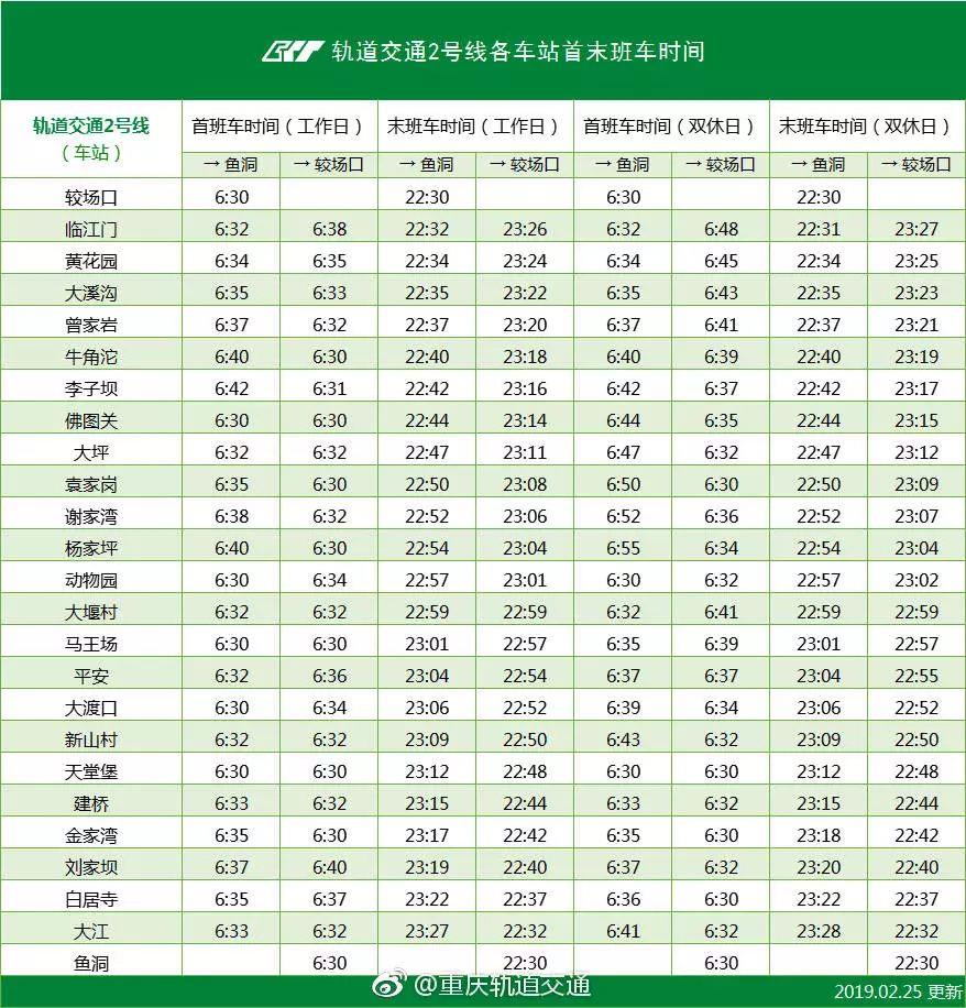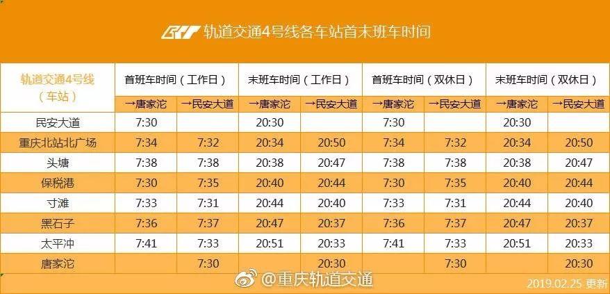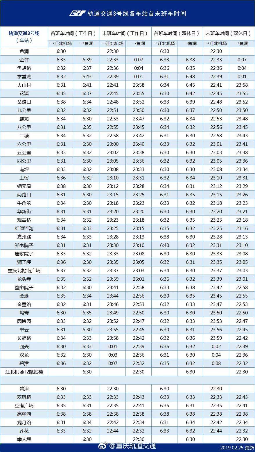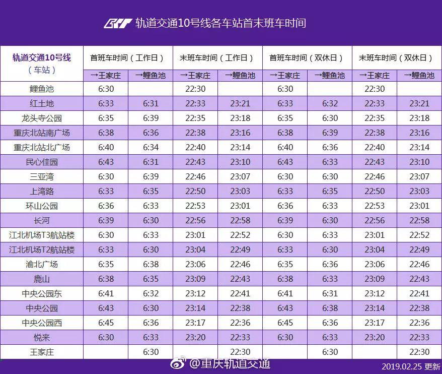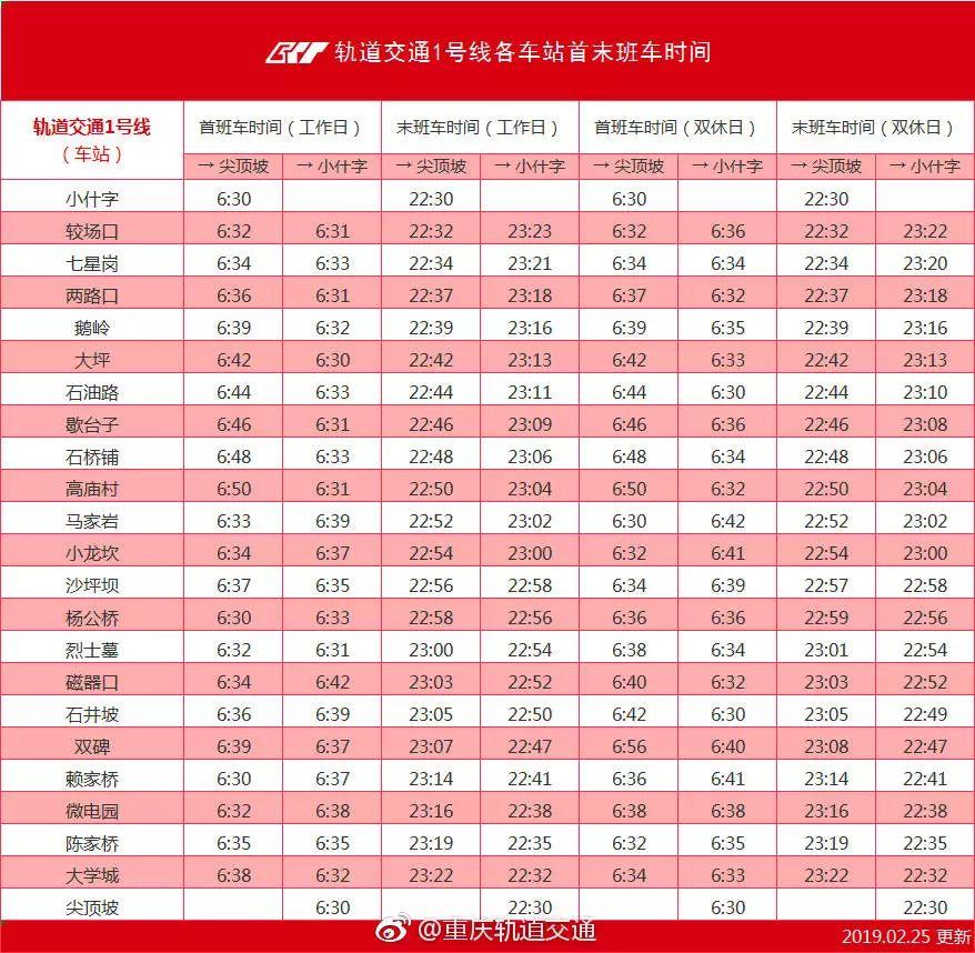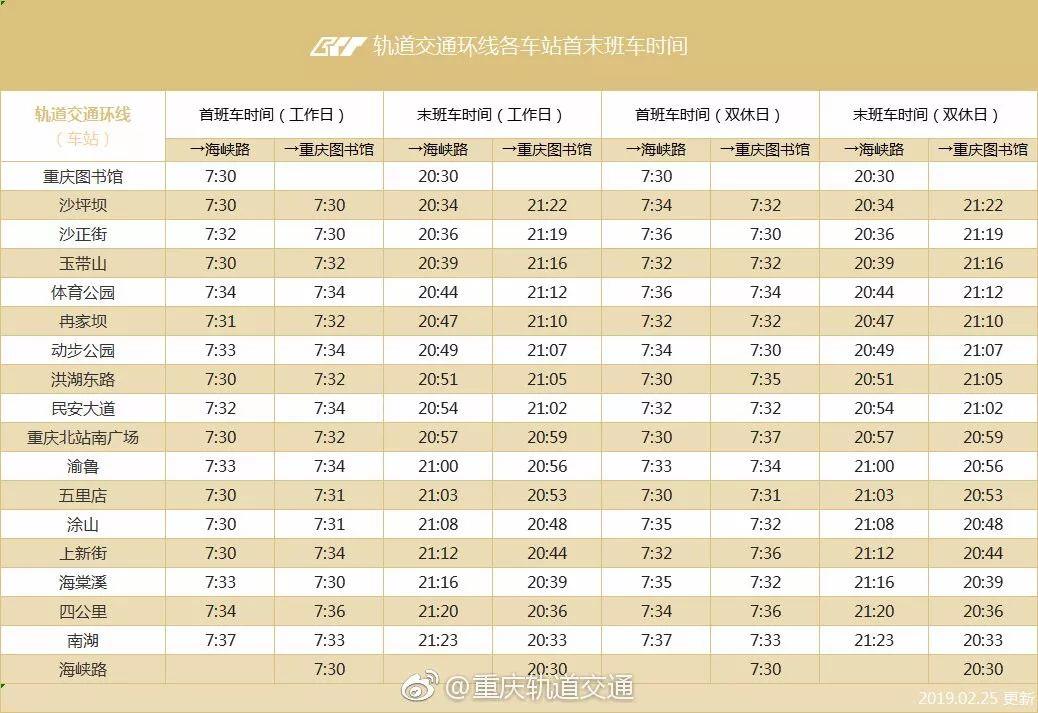 今(25)日,重庆轨道集团发布重庆轨道交通运营线网首末班车最新时间表,包括1号线、2号线、3号线、4号线、5号线、6号线、10号线、轨道环线运行时间。