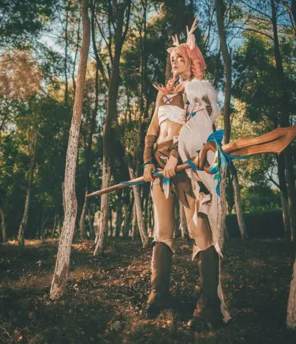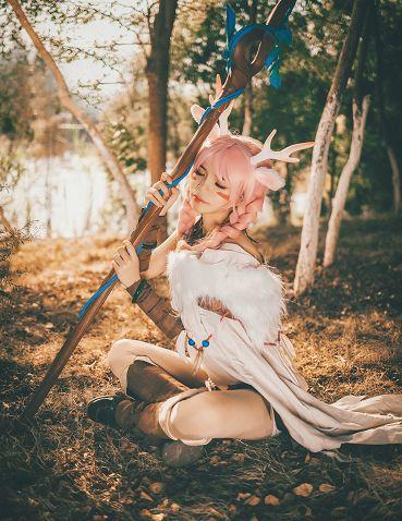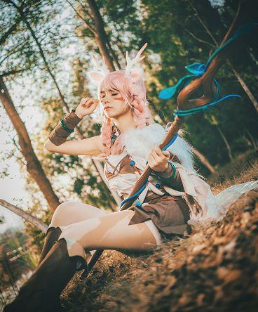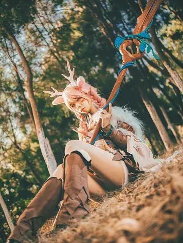 粉红色假发处理的非常柔顺,扎着两个麻花辫,就连头上的鹿角做的也是非常逼真。而且为了更好的还原瑶的形象,coser选择了内衣外穿,就连棕色的长靴也仿照瑶妹的鹿腿,再加上米白色披风,闭上眼睛的时候十分唯美,小姐姐和背景完美融合在了一起。