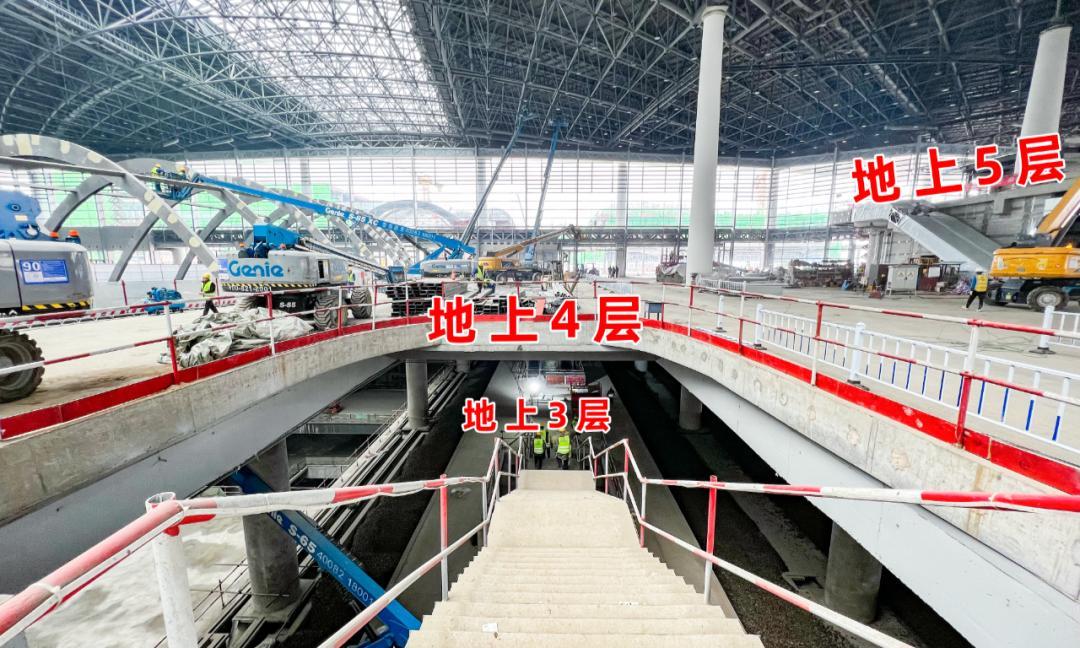 地上三层为铁路站台层,地上四层为高架候车室和高架落客平台,旅客可通过高架车道落客平台快速进站。