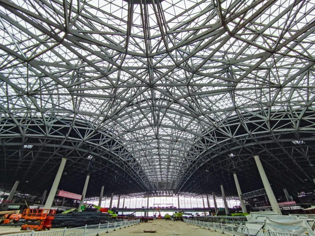 杭州西站站房屋盖钢结构总长326米,宽245米,,屋盖主体结构中间采光顶区域采用正交双向平面桁架,最大跨度78米,投影面积约79870平方米,总重量约1.1万吨。图源:长三角铁路