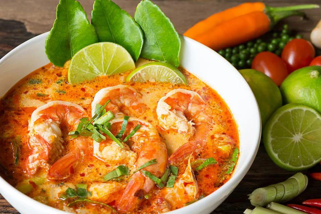 Tom Yam Goong(冬阴功汤)– 一种美味的汤,有柠檬草,南姜,青柠,辣椒,椰浆和虾。