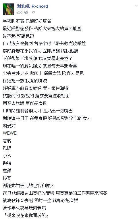 谢和弦日前先是点名田亚霍「基本功没练好就出来唱」,而后炮口又对向五月天、SpeXial,他13日早上在脸书上PO出道歉文,坦承「我真的嘴贱」,他也表示最近因躁郁症发作,带给粉丝极大负面能量,「自己没有察觉到,言语字眼已带有强烈攻击性。」在亲近的人提醒下,才惊觉自己已在暴走边缘,经反省过后,决定之后只要专心在音乐创作上,「管人家住海边!」