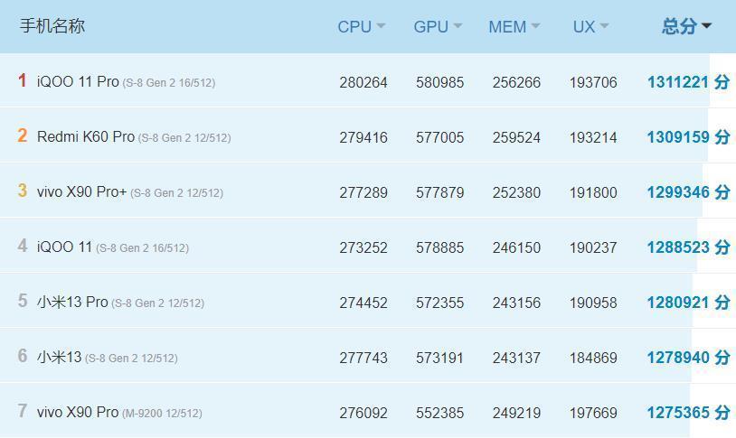 手机的主要性能是衡量手机好坏的重要指标之一,而手机主要性能主要依托于手机的处理器和调校,而每个手机厂商对处理器的调校方法都是不一样的,有些品牌注重性能平稳发挥,有些品牌则更倾向于压榨出更强的性能,以达到更极致的游戏体验。而很多人在买手机之前,除了自己对品牌认知之外,往往也会参考一些评测机构或者是网站给出的性能评测排名。这不知名评测机构安兔兔给出来最新一期的手机性能排行榜,这个榜单相比前段时间给出来榜单,可以说是彻底颠覆,毕竟骁龙8 GEN2芯片发布之后,很多厂商都拿到了其产能,也都纷纷发布了自家的产品,而榜单中前六名也都是以高通骁龙8 Gen2手机为主,其中小米13 Pro未进前四,很让人意外。