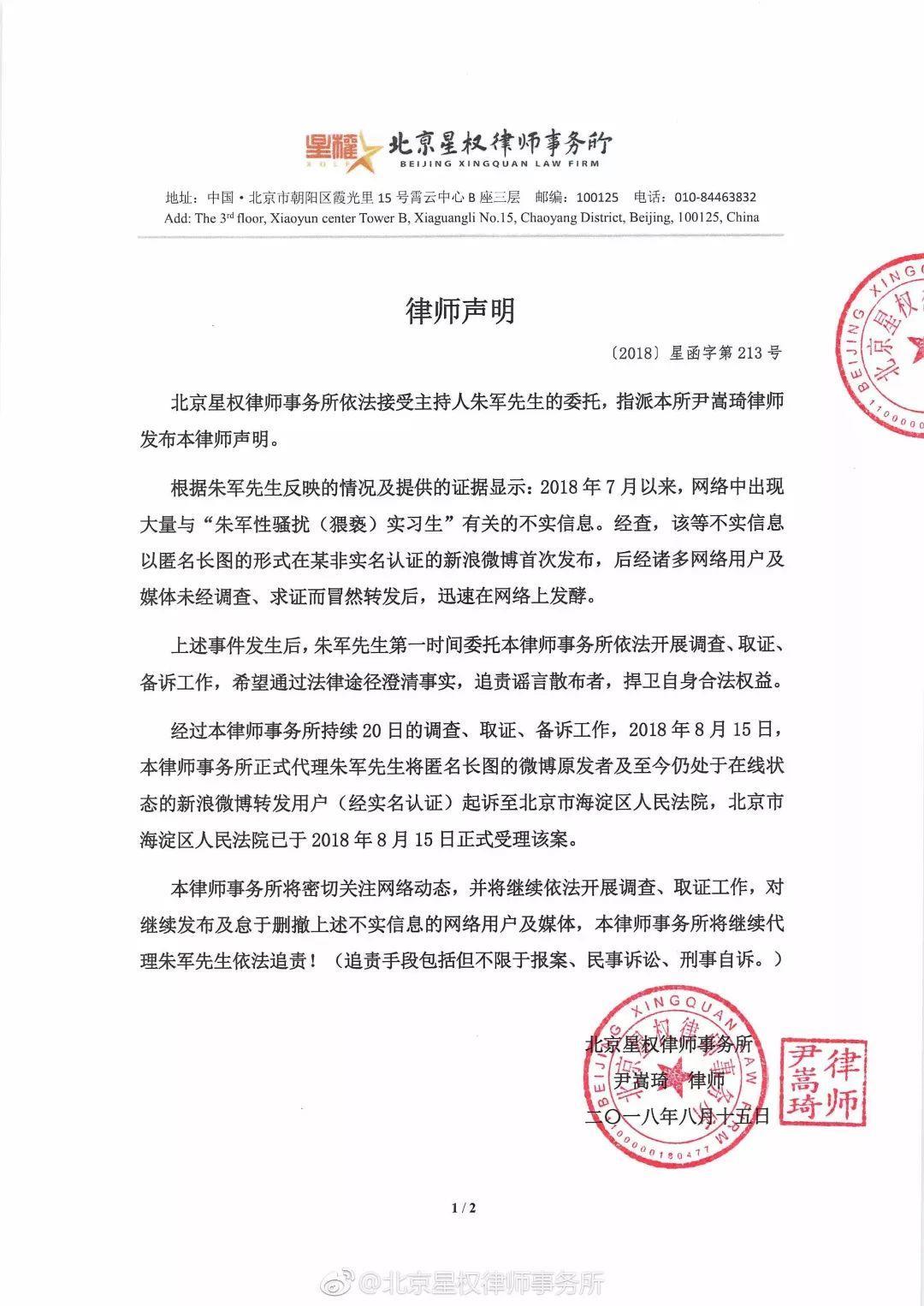 2018年8月15日,北京星权律师事务所在其微博发布“朱军律师声明”,声明称,近日来网络上出现大量“朱军性骚扰实习生”有关的不实信息,事务所受朱军委托调查取证,今日将匿名长图的微博原发者及至今仍处于在线状态的新浪微博转发用户(经实名认证)起诉至北京市海淀区人民法院。