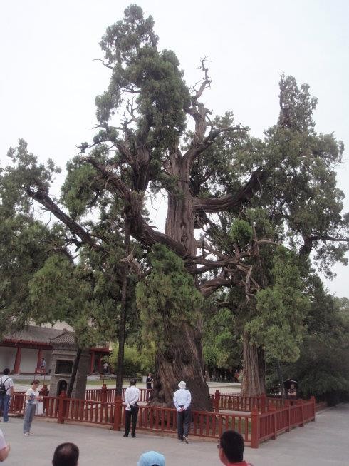 “大将军柏”树高12 米,胸围5.4米。冠幅16米。树身向南斜卧在“凸”字墙上。树冠浓密宽厚,据传汉武帝于元封年(公元前110年)游嵩山时,见二株柏树非常高大,一时高兴,将其封为“将军”。赵朴初老先生留有“嵩阳有周柏,阅世三千岁”的赞美诗句。经林学专家鉴定,将军柏为原始柏,树龄有4500年,是我国现存最古最大的柏树。这颗仍然老当益壮、青春勃发的古柏实在令人肃然起敬,无疑,它是我