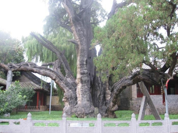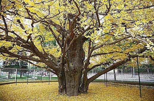 这里的银杏有600多年之久传说李自成攻入北京前夕曾在树下拴马露营所以人们称它为“李自成拴马树”传说,在清朝时,每换一位帝王此树都要长出一条支干,再与老干重合,乾隆便赐封此树为“帝王树”,同时又封西侧那棵为“配王树”。北方高僧皆宜以此树代表菩提树,视为佛门圣树。帝王树相传为辽代遗物,距今已近千年。东侧的一株称"帝王树",西侧的一株称"配王树"。这两株古树都是我国的活化石--银杏树