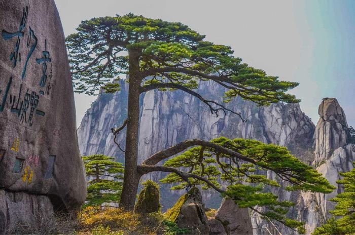 迎客松,在黄山玉屏楼左侧、文殊洞之上,倚青狮石破石而生,高10米,胸径0.64米,地径75厘米,枝下高2.5米,树龄至少已有800年,黄山“四绝”之一。迎客松是黄山的标志性景观,也是安徽省的象征之一,从人民大会堂铁画《迎客松》至车站码头,都有它的身影。迎客松已经成为中国与世界人民和平友谊的象征。