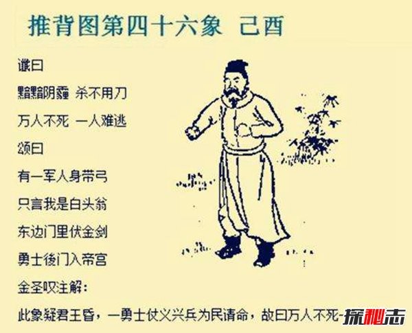 在这本书第46象中,己酉谶曰,黯黯阴霾。杀不用刀,万人不死,一人难逃。这个可能说的是杀人不用刀的黑暗社会,甚至说错一句话就可能被杀,中间有人出来反抗,但是最终罪魁祸首被抓出来法办之类的。