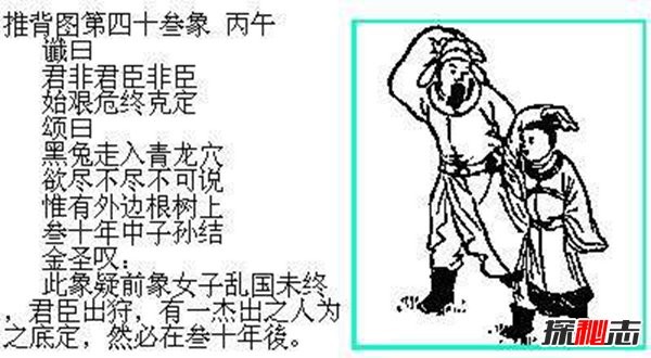 在这本书第42象中,君非君,臣非臣;始艰危,终克定;颂曰:黑兔走入青龙穴,欲尽不尽不可说;惟有外边根树上,三十年中子孙结。