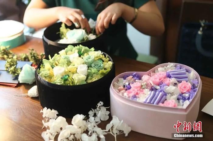 宗敏是斗南花市的批发商,她告诉记者,店内的皂花、水晶花等永生花销量远超鲜切玫瑰,现在一天能卖3、40束,是玫瑰花销量的5倍。“顾客都更青睐性价比高的东西,鲜切红玫瑰不再是节日首选礼品。”