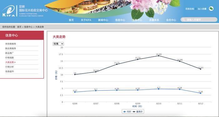 据昆明国际花卉拍卖交易中心数据,2月5日是情人节高峰期备货第一天,拍卖交易总量约411万枝,单头玫瑰A级最高价10.41元/枝,多头玫瑰最高价12.76元/枝;9日,拍卖交易总量约483万枝,单头玫瑰A级最高价15.56元/枝,多头玫瑰最高价12.65元/枝。