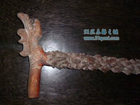 降龙木杖的杖身不要选取笔直的,要选取弯的。一般的要选取50年以上的。大约直径在5厘米左右,其中皮占2厘米。只有五十年以上才会形成明显的节。以弯的弯节越多越好,最好的,一米五的杖。可以形成九道弯,非常漂亮。好的杖不仅要有九弯,而且杖本身还会扭曲。一般的扭曲的环数不同。最少一曲,多多益善。如果一个独杆的降龙木,要是有九弯九曲还是九道。看上去就和一个古藤无异。那就不是一般人可以用的了。