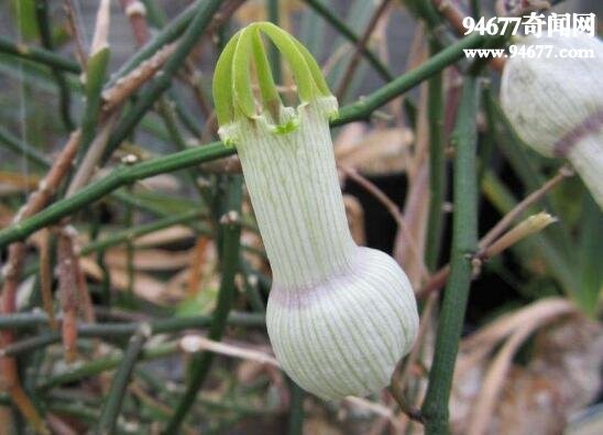 降落伞花学名为“Ceropegia woodii”。这种奇异植物的花朵呈现降落伞形状,内部的花瓣好象灯丝一样连接四周,花朵中心就像是一根毛茸茸的棒棒糖从内部伸出。整个花朵收拢起来就会形成一个管状物,边缘有许多细小的茸毛向外伸展。当有昆虫被花朵的气味吸引而来时,就会被管状物包裹其中,从而成为降落伞花的营养餐。不过,降落伞花从来不吃苍蝇。当苍蝇飞来时,降落伞花会将其包裹于花朵中,直到茸毛最终松开,苍蝇才可得以逃脱。当苍蝇飞走时,它也带走了降落伞花的花粉。苍蝇只是它们传粉的工具而已。
