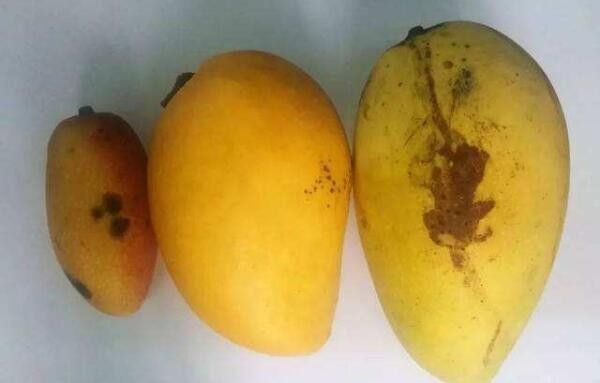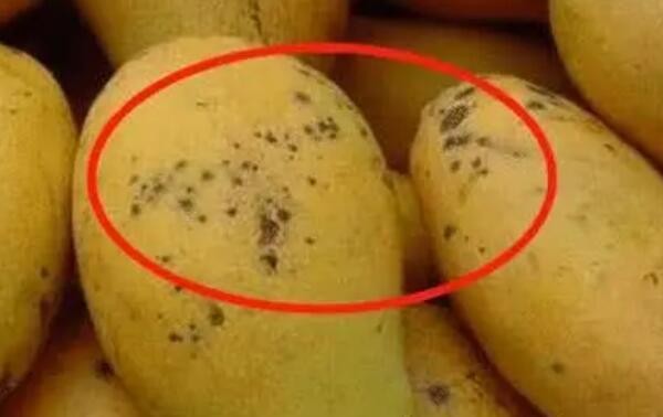 大黑点芒果:在水果摊,带大斑点的芒果一般会被商家低价处理,这时候千万不要摊便宜,因为带大黑点的芒果里面已经出现了不同程度的腐烂,味道也会带酒气,最好不要食用。而且长了大黑斑的芒果是霉菌产生的展青霉素,展青霉素可以扩散到果实的其他部位。