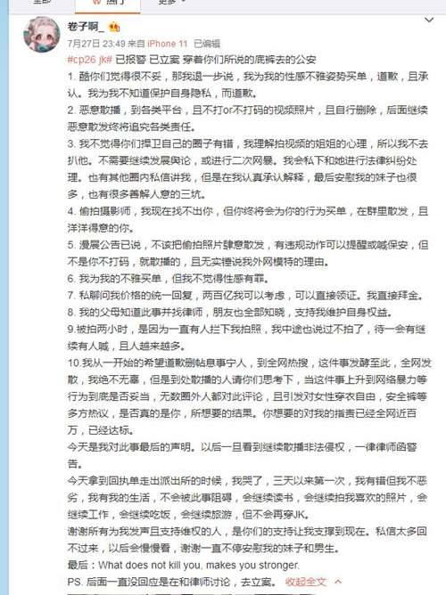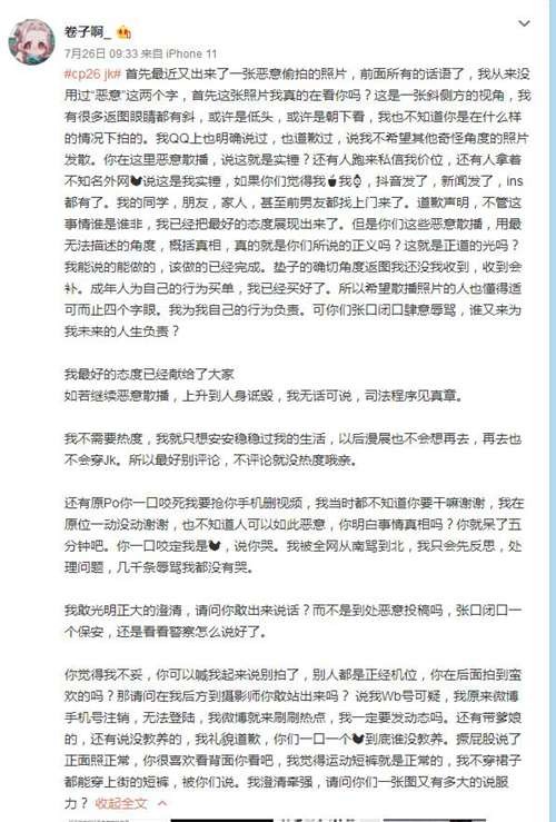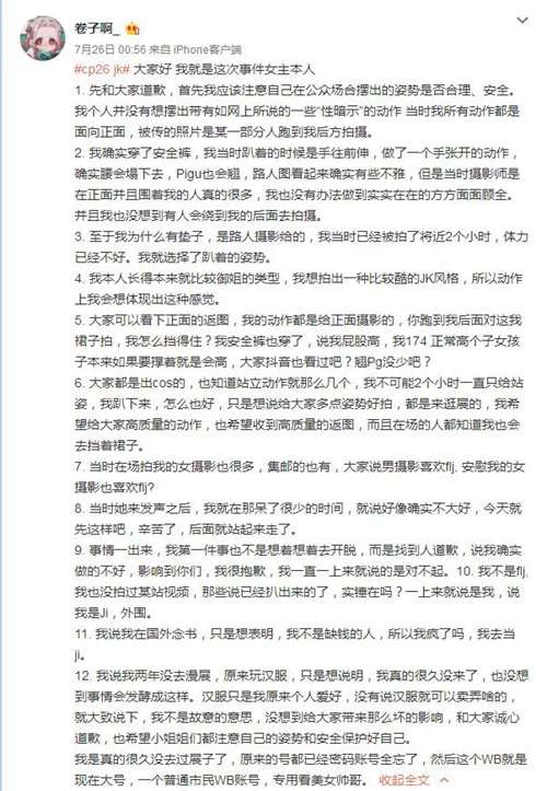 从声明上来看JK事件女主认为并没不雅姿势,而是某一部分人(摄影)跑到后方角度乱拍摄。当时穿了安全裤,但是路人实在太多,有很多摄影在正面围绕着女主,女主并没有办法做到实实在在的周全,女主没料到有人会绕到后方。当时已经拍了两个小时,体力不好,所以选择了一些趴着的姿势。女主角最后也表明,自己两年没有去漫展,原来是COS汉服的,只是想说明她真的很久没来了,但没想到这次事情发酵成这样。汉服是她个人的爱好。总结一下,女主角当事人,不存在故意的意思,没想到给二次元的动漫迷带来这么坏的影响,也希望其他COS者注意自己的姿势和安全。最后,女主角还留言给大家,可以接受大家的指责,完全都可以接受,但是也希望大家可以客观一点对待他。