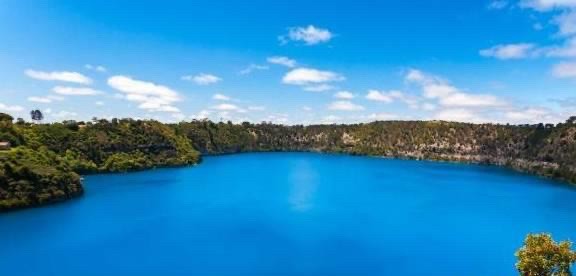 蓝湖位于南澳州东南部的甘彼尔山,是澳大利亚南部著名的天然湖泊之一。海拔有1200米高,附近群山环绕,森林密布,有着非常宜人的环境。这里的森林覆盖率很高,充足的水源使得植被非常的茂盛。从湖面一眼往下看,80米内的动植物都能看得一清二楚,水体洁净度几乎能和蒸馏水相比较。幽蓝的湖水下面是独自泛着绿光的青苔,让这个水体多了分色彩和层次。